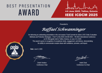 Raffael Schwanninger, wissenschaftlicher Mitarbeiter am Lehrstuhl für Leistungselektronik (LEE), wurde mit dem „Best Presentation Award“ bei der IEEE International Conference on DC Microgrids (ICDCM 2025) in Tallin, Estland ausgezeichnet – herzlichen Glückwunsch!