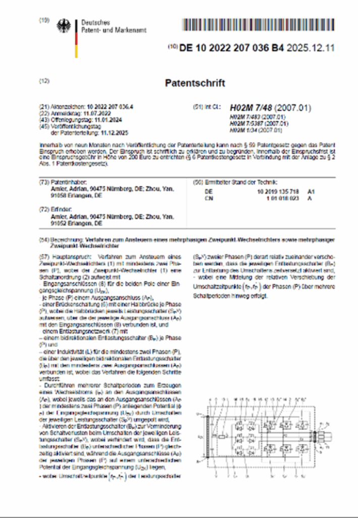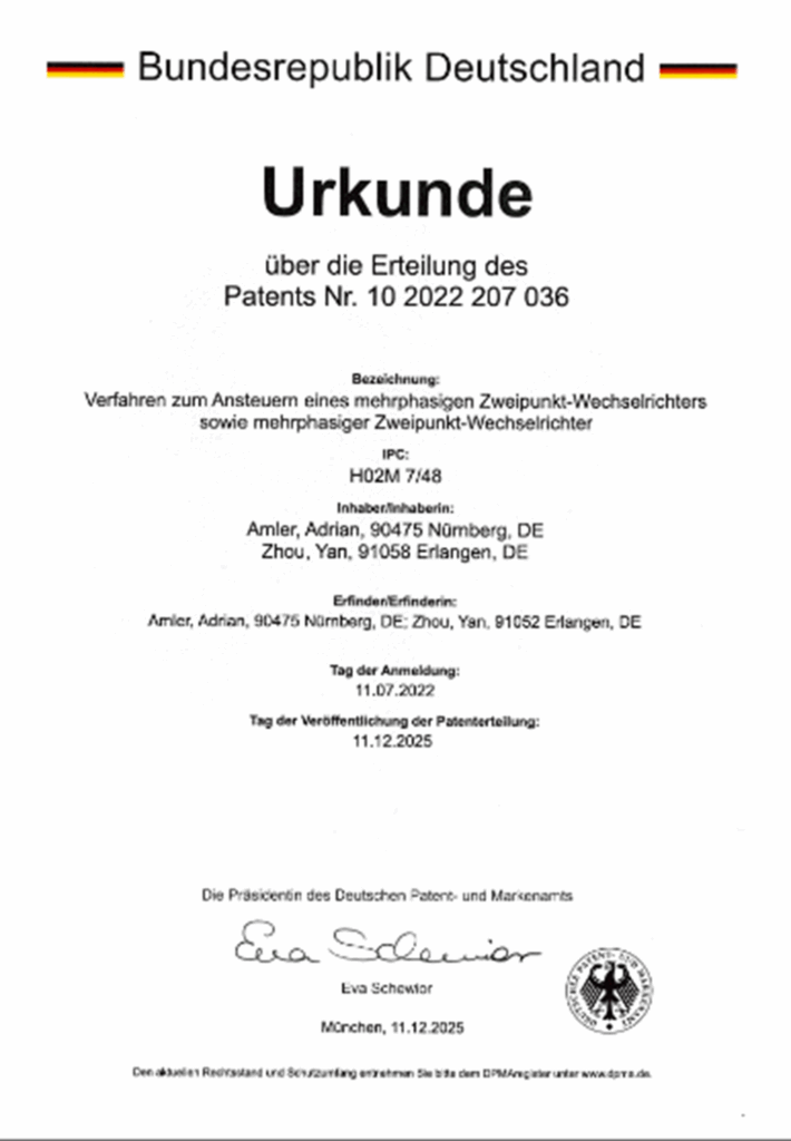Wir freuen uns über die Erteilung des Patents für unser „Verfahren zum Ansteuern eines mehrphasigen Zweipunkt-Wechselrichters“.